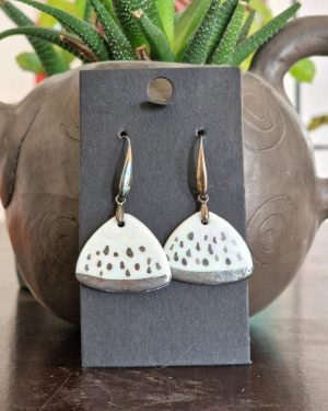 Ienesiet savā tēlā gaismu un mieru ar auskariem “Debesu Mēness” — baltiem kā mākoņu pieskāriens un rotātiem ar zeltu kā zvaigžņu atspīdums. Roku gleznota zelta apmale un centrālais akcents piešķir šiem pusmēness formas auskariem patiesi debesīgu eleganci.