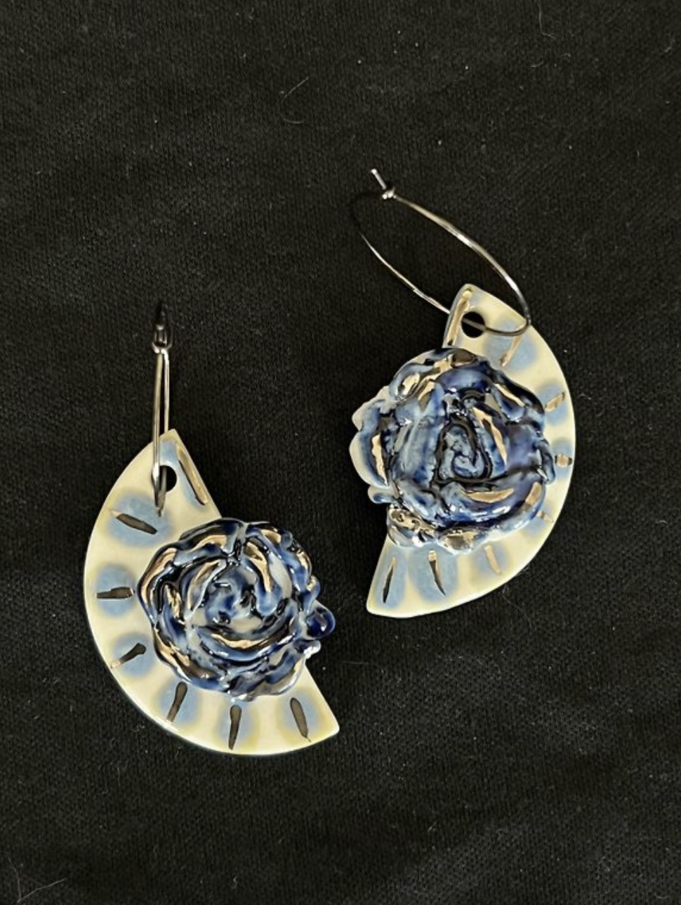 Šie porcelāna auskari atgādina rožu gleznojumu uz veca porcelāna šķīvja — pusapļa forma un trīsdimensionālais ziedu reljefs piešķir tiem izteiktu māksliniecisku noskaņu. Ideāli tiem, kas novērtē detaļas un meklē unikālu rotu ar raksturu.
