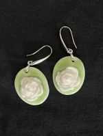 Balta porcelāna roze, kas kā pienains zieds uz piparmētru fona rotā šos skaisti noapaļotos auskarus. Tie izstaro tīrību, maigumu un sievišķīgu eleganci.